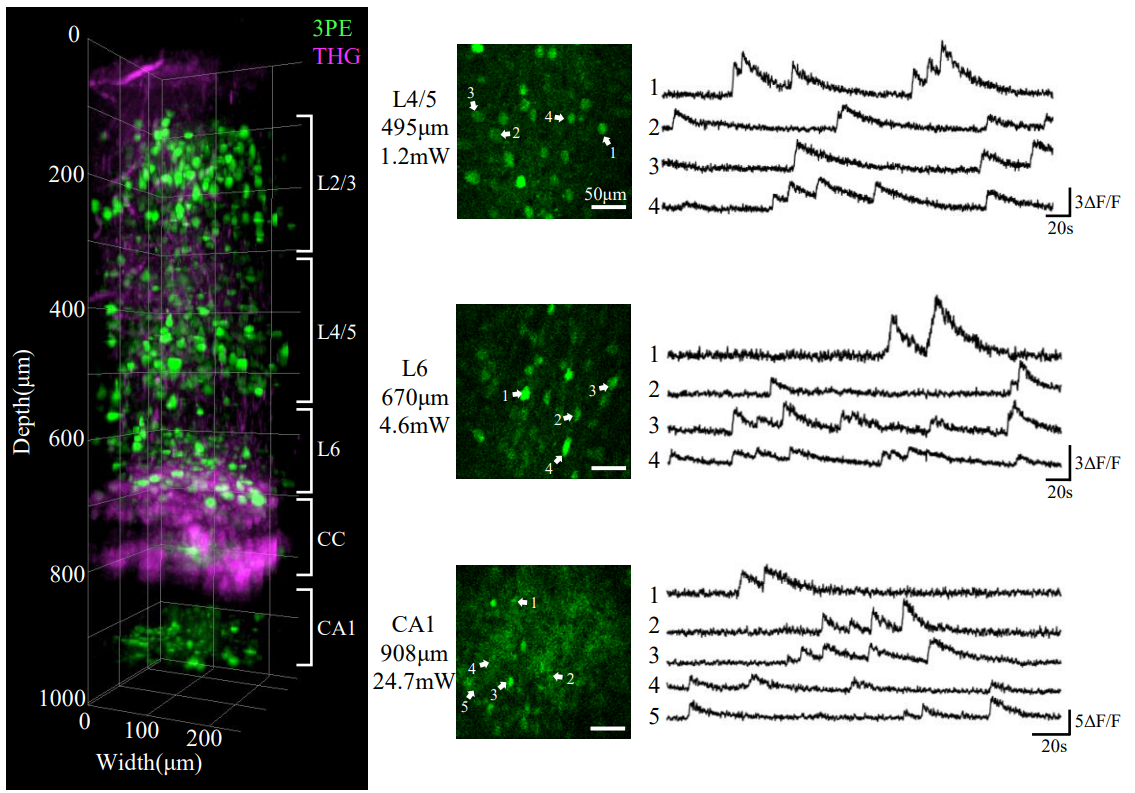 图2 微型三光子显微成像记录小鼠大脑皮层L1-L6和海马CA1的结构和功能动态。CC:胼胝体。绿色代表GCaMP6s标记的神经元荧光钙信号,洋红色代表硬脑膜、微血管和脑白质界面的三次谐波信号