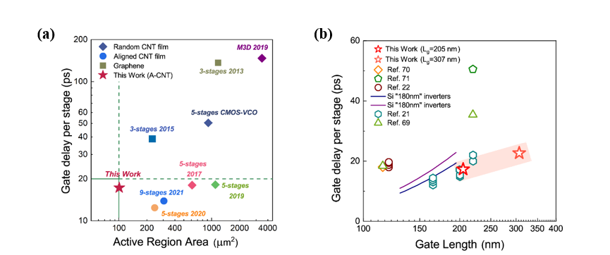 、碳基电子学研究中心、纳米器件物理与化学教育部重点实验室张志勇教授课题组与浙江大学材料科学与工程学院金传洪教授课题组合作,对阵列碳纳米管单片三维集成关键工艺深入研究,利用具有自发平坦化的旋涂玻璃硅(SOG)材料,实现了高质量层间介质制备,具有高平坦度,低表面粗糙度(Ra<0.5 nm)与低介电常数(k~3),实现了碳管晶体管超细粒度的垂直集成,层间对准精度接近20 nm(图1a-d)。底层阵列碳管晶体管表现出超高的开态驱动性能,在90 nm栅长和-0.7 V漏端偏压下具有1.84 mA/μm的饱和电流与1.65 mS/μm的峰值跨导,超越了硅基45 nm节点PMOS晶体管跨导能力(图2a-c)。基于定向无损的低温转移工艺,团队在层间介质表面制备了高密度阵列碳纳米管,场效应迁移率高达650 cm2/Vs;通过满足底层晶体管稳定性的低温制备工艺,团队在上层构建了阵列碳管顶栅晶体管,开态电流密度超越硅基、有机半导体、二维材料等单片三维集成研究工作中上层晶体管的性能(图3.a-d)。团队进一步实现了电路层级的拓扑,制在100μm2面积内实现了单片三维集成的五阶环形振荡器电路,并最高取得5.78 GHz的输出振荡频率(图4a-d),对应17 ps的单级门延时,实现了纳米材料领域内速度最快、面积最小的三维集成电路(图5a-b)。