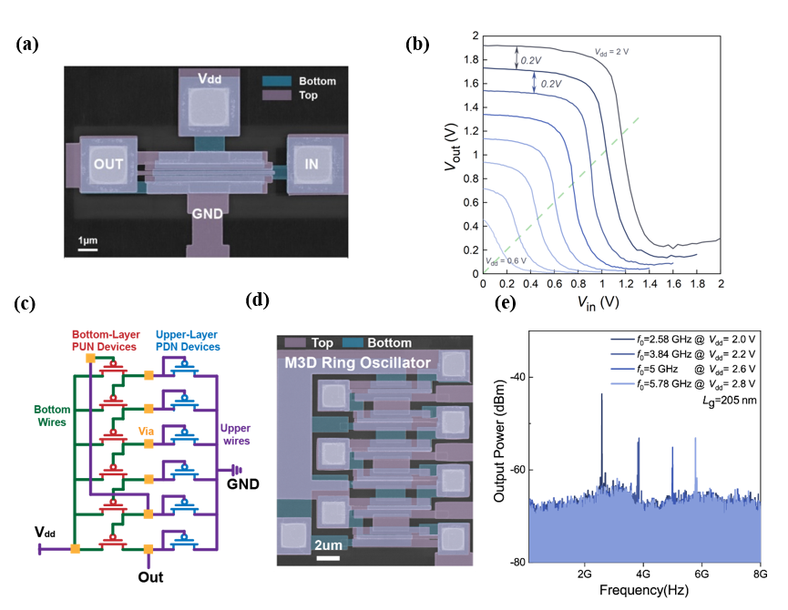 图4:单片三维集成反相器与五阶环形振荡器表征