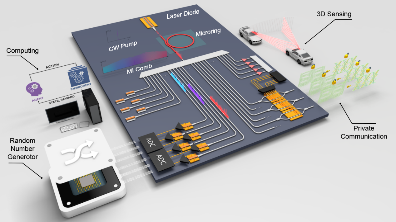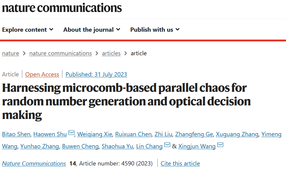 王兴军教授-常林研究员-舒浩文研究员联合团队在Nature Communications杂志在线发表文章“Harnessing microcomb-based parallel chaos for random number generation and optical decision making”。文章验证了基于混沌微腔光梳的大规模并行混沌信号产生方案,解决传统混沌系统缺乏高速并行混沌源的瓶颈问题,首次与硅基光电子功能芯片结合,联合实现了片上超大容量的并行真随机数产生,并在光学决策应用场景进行演示验证,有望为下一代集成光电子信息系统提供基于并行混沌的全新信息处理工具箱。该技术的实现对于高速安全通信的跨越式发展具有关键意义。