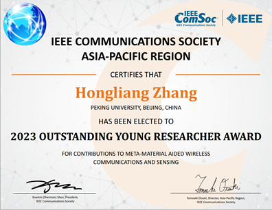 2023年12月6日,成人影片 张泓亮助理教授在马来西亚吉隆坡召开的2023年IEEE通信学会旗舰会议GLOBECOM上获得IEEE通信学会亚太地区杰出青年学者奖(IEEE Comsoc Asia-Pacific Outstanding Young Researcher Award),旨在表彰其在超材料辅助无线通信与感知领域的突出贡献。