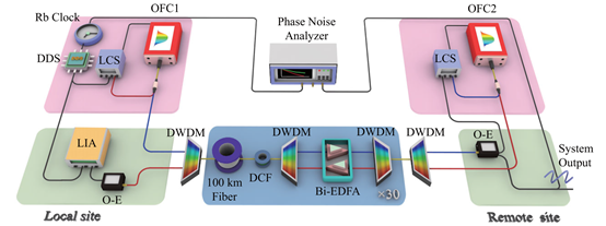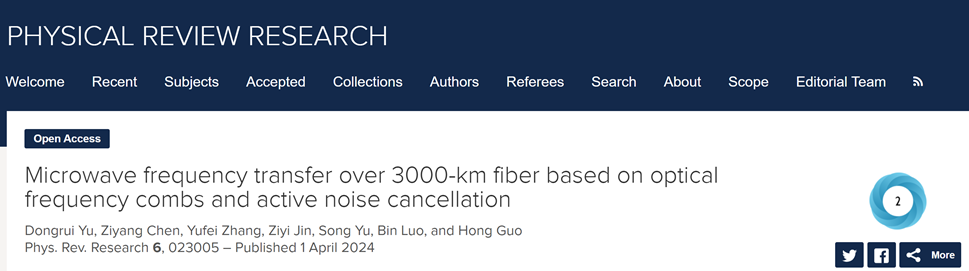 —北京邮电大学联合研究团队在高精度超远距时间频率传递方面取得标志性进展,针对超长跨距时间频率信号传递中的噪声抑制等难题提出系统性解决方案,利用高信噪比的光学频率梳实现实验室光纤三千公里无电再生的时频信号低损传递,成功实现了对高精度铷原子钟的频率稳定度远端复现。相关成果以“Microwave frequency transfer over 3000-km fiber based on optical frequency combs and active noise cancellation”为题,在线发表于《物理评论研究》(Physical Review Research)[1]。