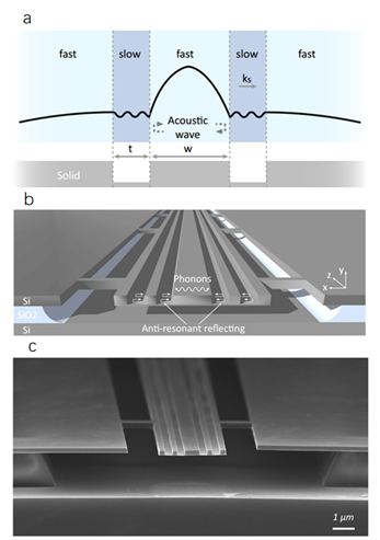 反谐振声波导的工作原理如图(a)顶部所示。为了将声场有效限制在声速较快的中间层,可通过调节声速较慢的侧边层来实现反谐振反射。此时声波被反射回中间层,形成图(a)中黑色实线所示的声场分布;这一机制与光学中的法布里-珀罗谐振腔(下称“F-P腔”)类似,通过调节F-P腔的长度以实现反谐振状态。不同的声速层可由硅、二氧化硅等不同的材料层构成,然而,在芯片上构建这种横向多层结构颇具挑战。为此,研究团队提出了一种新颖的解决策略,即在中心波导两侧刻蚀出宽度为t的空气槽(见图(a)),使得空气与固体之间的界面产生几何软化,降低了其有效声速,从而构建出反谐振反射层。