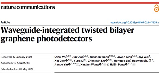 化学与分子工程学院彭海琳课题组合作,利用扭转双层石墨烯作为光吸收材料,实现了兼具高响应度和高带宽的硅波导集成扭转双层石墨烯光探测器的制备,相关工作以“Waveguide-integrated twisted bilayer graphene photodetectors”为题,于2024年5月1日,发表在《自然·通讯》(Nature Communications)期刊上(Nature Commun.2024,15, 3688)。