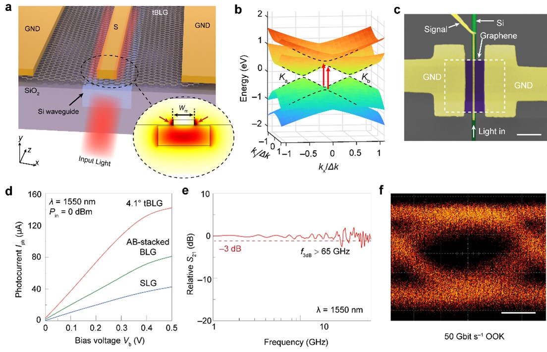 在此工作中,联合研发团队将扭转双层石墨烯(tBLG)与硅光集成,通过对扭转角度的设计,使tBLG能带中范霍夫奇点(vHs)的能级差与1,550 nm通信波段的光子能量相匹配,显著增强了与光的耦合效率;另外,tBLG能带在接近狄拉克点处的线性色散关系使其具有与单层石墨烯接近的超高迁移率,保证了器件具有优秀的高频性能。仿真结果表明,tBLG相比于单层石墨烯具有约3倍的耦合效率提升,可以有效缩短沟道长度,并提升光响应度。