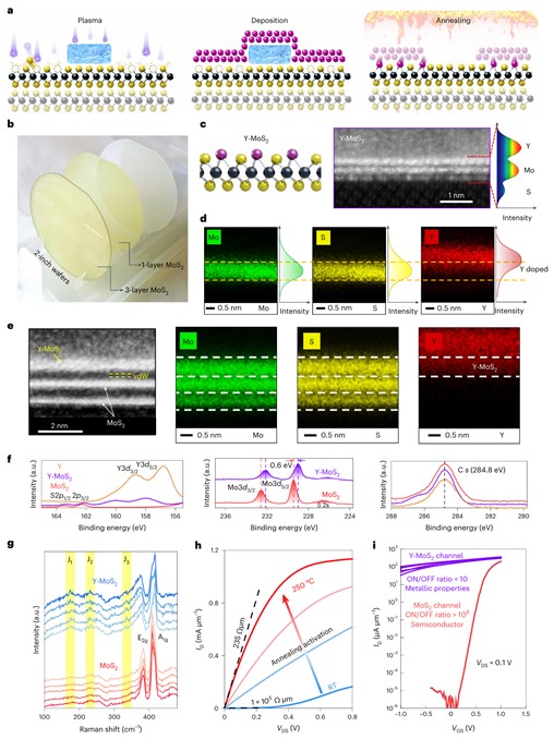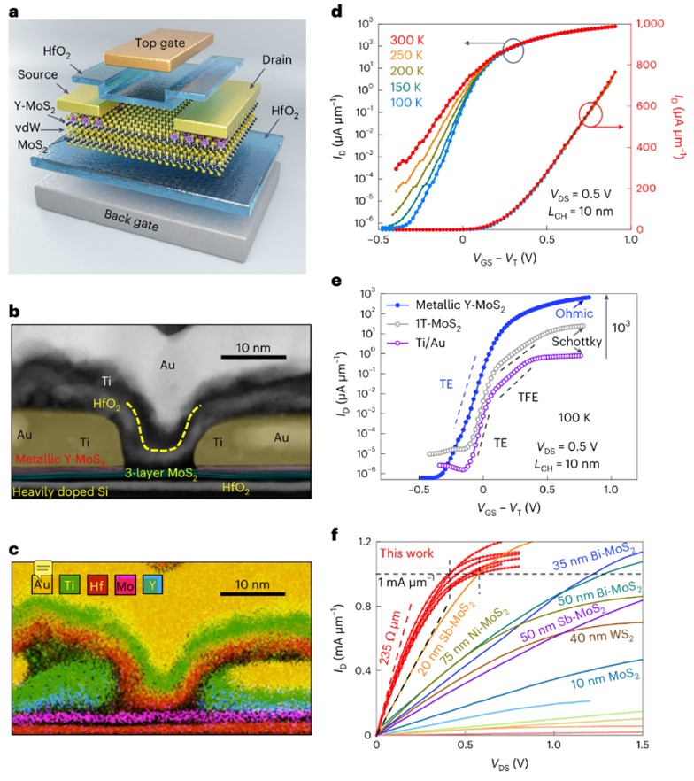 近期,成人影片 彭练矛院士-邱晨光研究员课题组在二维半导体集成工艺方面提出了“稀土钇元素诱导相变理论”,并发明了“原子级精准选区掺杂技术”,突破了传统离子注入掺杂结深无法小于5纳米的工程限制,首次将源漏选区的掺杂深度推进到单原子层0.5纳米极限,并基于二维半导体晶圆规模化制备出超短沟道弹道晶体管,实现了理想的欧姆接触和开关特性,有潜力构建未来更高性能、更低功耗的亚1纳米技术节点芯片。相关研究成果以“Yttruim-doping-induced metallization of molybdenum disulfide for ohmic contacts in two-dimensional transistors”为题,2024年5月27日在线发表于《自然·电子学》(Nature Electronics,原文链接://www.nature.com/articles/s41928-024-01176-2)。姜建峰博士与徐琳博士为共同第一作者,邱晨光研究员和彭练矛院士为共同通讯作者,成人影片 为通讯单位。论文合作者为中科院物理所张广宇研究员与杜罗军研究员。