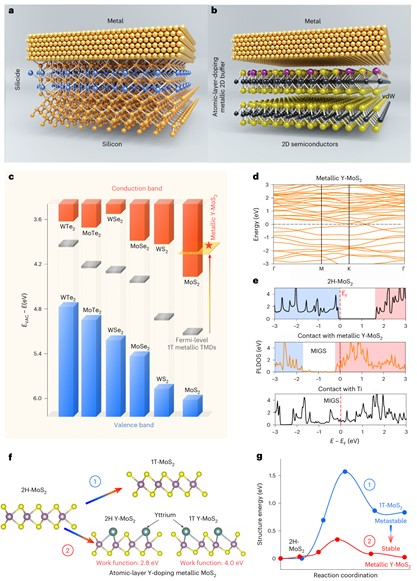 1.开创性地提出了“稀土元素诱导二维金属化理论”。该技术通过钇原子掺杂诱导的方式,将接触区域的二维半导体转变为二维金属。并以此二维金属作为金属与半导体之间的缓冲层,抑制了界面处的费米钉扎效应,该缓冲层作为“桥梁”,有效地提高了载流子从金属到半导体的传输效率。钇原子掺杂有效调控了二维金属的费米能级的位置,以实现理想的能带对齐和器件的欧姆接触,克服了本征二维相变固有肖特基势垒的科学挑战。