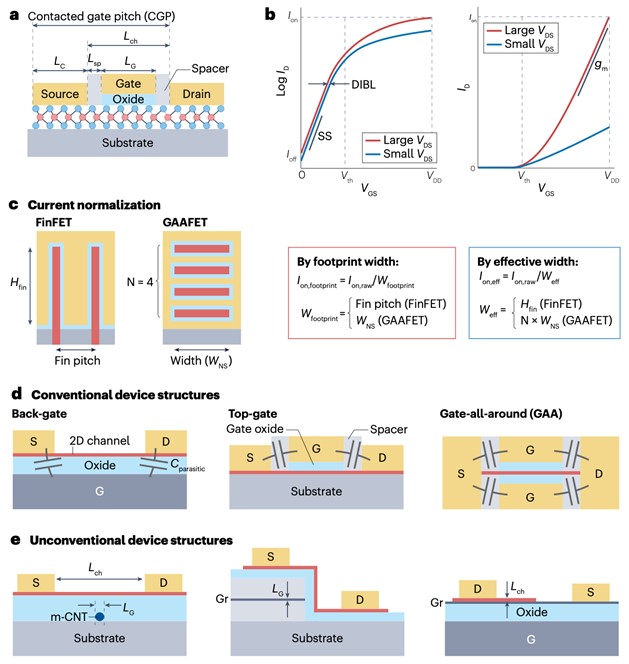 文章提出,随着二维晶体管的发展和成熟,其与商用硅基器件的直接比较是走向产业化的先决条件。逻辑器件基准测试的主要标准为性能(Performance),功耗(Power)和面积(Area),应在这三个方面对二维晶体管进行协同优化和基准测试。在性能方面,推荐使用本征门延迟τ和开态电流ION作为基准指标,并且应在给定供电电压VDD和关态电流IOFF目标的前提下比较ION,为了公平比较不同器件结构,建议使用有效宽度Weff(图1c)进行电流归一化;在功耗方面,降低VDD和寄生电容(图1d)对降低功耗至关重要,推荐使用给定ION、IOFF目标下的VDD,以及能量延迟积(EDP)作为基准指标;在面积方面,栅极长度LG和沟道长度Lch是重要指标,也应同时考虑接触和侧墙的尺寸,推荐使用接触栅极间距(CGP,图1a)作为基准指标,而对于非传统器件结构(图1e),应比较器件在芯片上实际占据面积。
