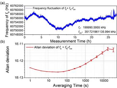 图3. 852 nm铯原子小型光学原子钟的频率随时间波动和频率稳定度指标