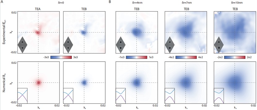 在研究中,团队利用光子晶体平板结构构造具有非平凡拓扑性质的光子能带。为解决波函数被封闭在体系内部难以直接观测的难题,团队提出利用辐射光子作为“信使”,将体系内部的能带拓扑信息投射在远场辐射的偏振信息中,成为一种直接观测开放体系拓扑性质的创新方法。团队理论上证明了光子辐射的几何特性与系统内在能带拓扑的关系,即 “辐射拓扑-能带拓扑的对应关系”(bulk-radiation correspondence)。团队发现远场辐射的偏振态作为可直接观测量,可直接反映非厄米体系光子能带的贝利曲率在二维动量空间中的分布。由此,团队构建了一个光学测量系统,对蜂窝晶格光子晶体平板中的贝利曲率以及谷-陈数进行了直接测量。