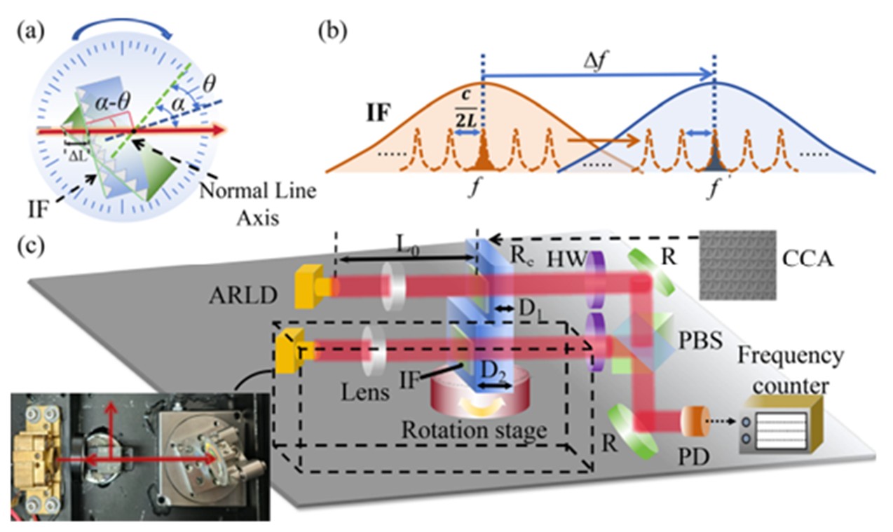 针对这一挑战,成人影片 陈景标教授课题组提出了一种基于激光频率测量的角度测量新方法——量子频率角度仪。激光频率对干涉滤波器旋转角度的高灵敏度,将角度信息转化为频率信息。系统通过干涉滤光片与角锥阵列的联合设计,使激光频率与旋转角度精确耦合,并利用IF-ECDL(基于干涉滤波器的外腔激光器)实现了无跳模的连续频率调谐。理论分析表明,该方法的角度分辨率可达0.0001角秒,较传统方法提升了一个数量级以上,极大拓宽了小角度高分辨测量的应用边界。
