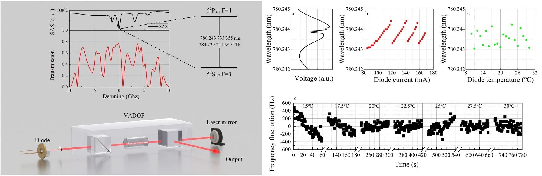 在精密时间频率领域,如何突破高性能光钟系统复杂、难以搬运、制造成本高的局限,实现在野外、移动平台等复杂外场条件下维持高精度连续运行,极具前沿研究价值。本工作聚焦佛克脱原子滤光器(Voigt anomalous dispersive optical filter, VADOF)在大光强、强磁场条件下的透射谱研究,揭示其独特物理机制,赋予佛克脱激光器频率“自对准”能力——自动锁定在铷-85原子D2线跃迁谱线。研究团队结合MTS稳频技术,成功研制小型佛克脱光频标。不仅实现了国际领先的长期频率稳定度(万秒稳定度达中系数10-13量级),且将VADOF“自对准”特性转化为光频标“即开即用”功能。该突破可解决现有光钟的痛点:高度依赖高性能本地振荡器,在长时间连续运行或剧烈环境冲击(如振动、温度骤变)下,频率稳定性显著下降,必须依赖人工干预进行重新锁定和维护,导致自动化运行中断。佛克脱光频标可从根本克服了该限制,实现真正意义上的全自动化、无人值守运行。