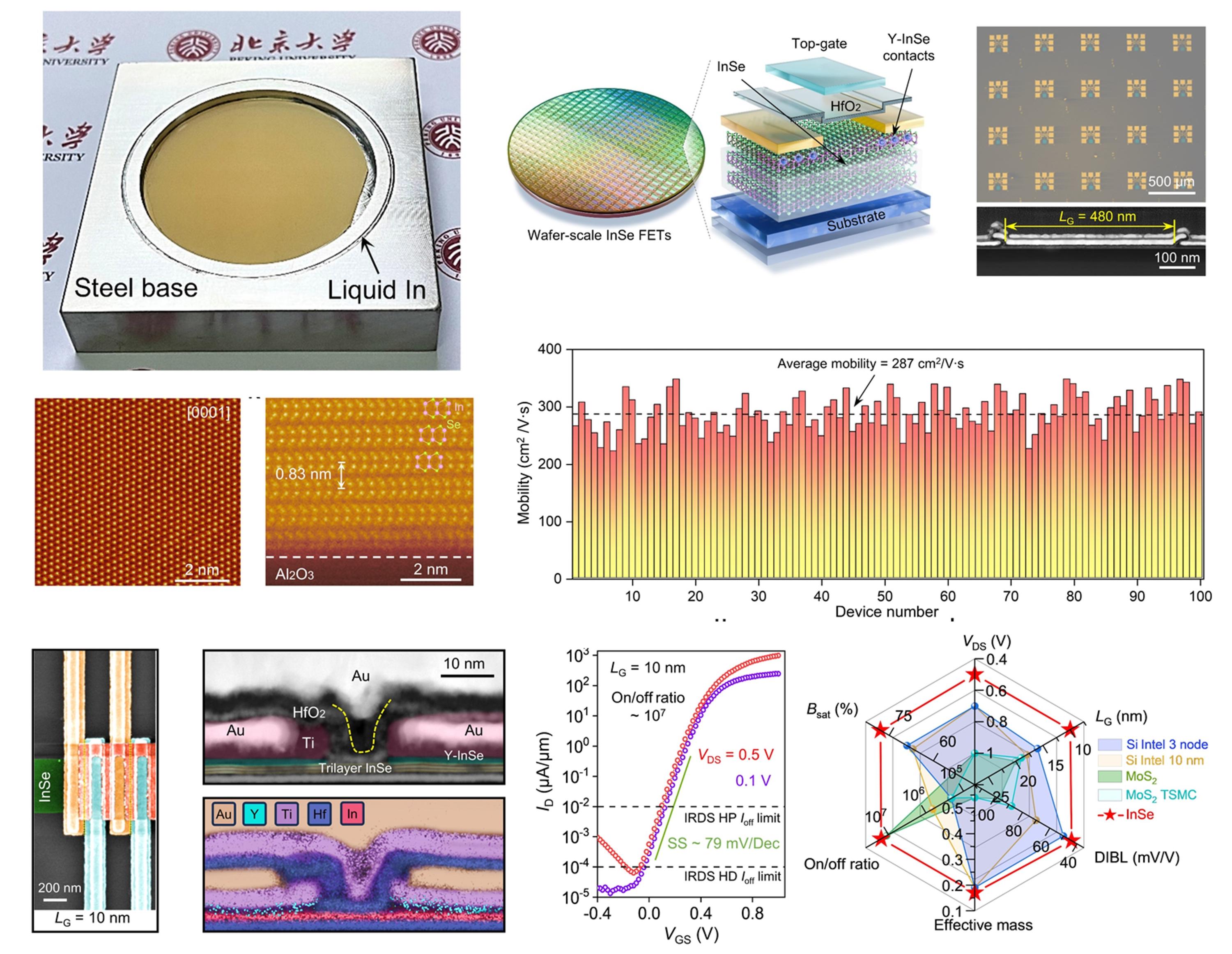 邱晨光研究员-彭练矛教授团队制备出“超越硅极限的弹道二维硒化铟晶体管”(Nature 616, 470–475,2023, ESI热点论文,谷歌引用270次,入选中国十大科技进展新闻,中国高等学校十大科技进展等),首次将二维硒化铟晶体管的性能推进到业界标准。然而,要将低维芯片技术从实验室推向业界,使晶体管迈向规模集成芯片,则需要将低维半导体材料的晶圆制备和器件电路集成加工两个关键环节相互打通。