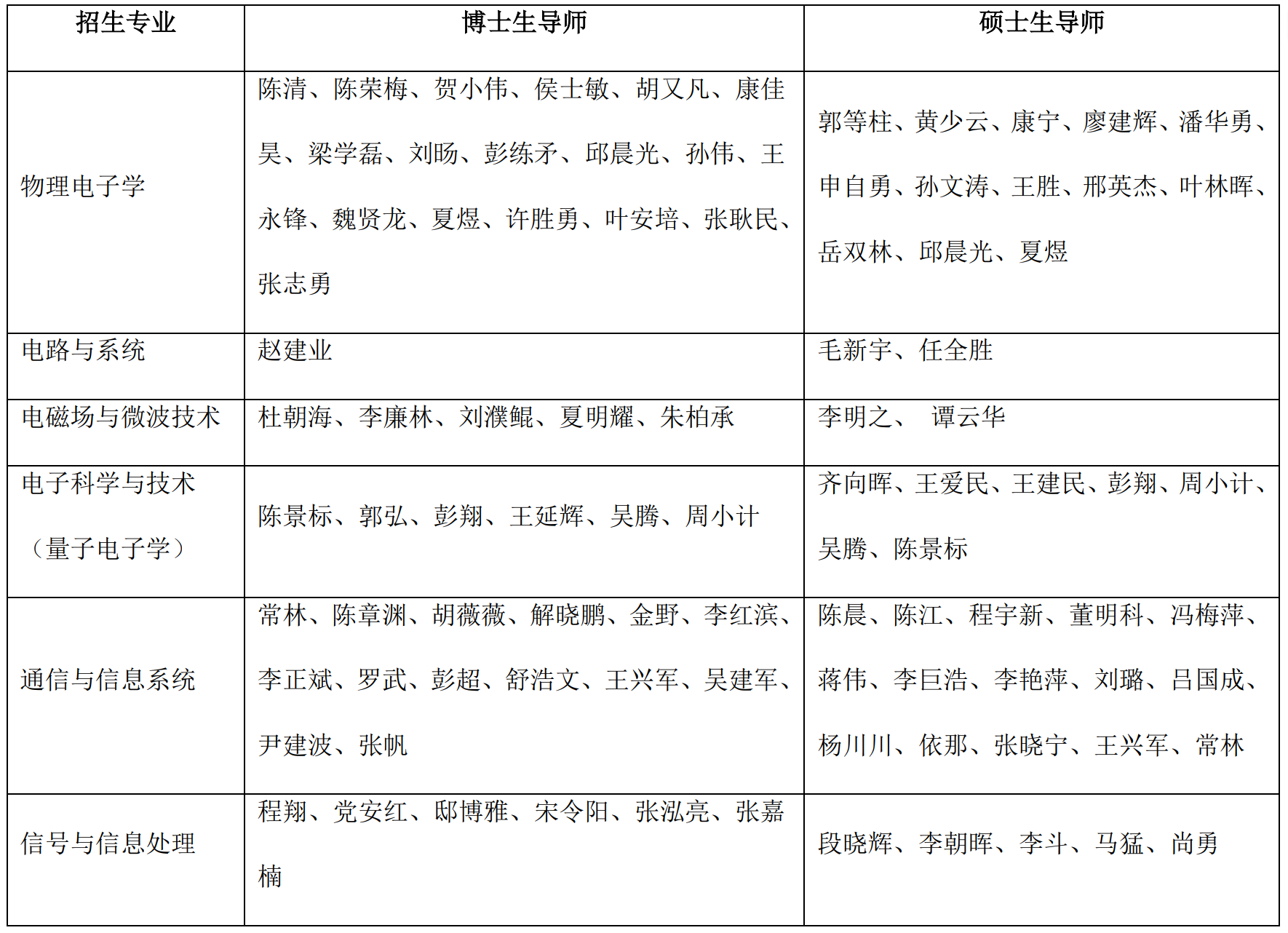 支撑6个二级学科(研究方向)建设,分别是物理电子学(博士点、国家重点学科);电路与系统(博士点);电磁场与微波技术(博士点);电子科学与技术(量子电子学)(博士点);通信与信息系统(博士点、国家重点学科)和信号与信息处理(博士点)。