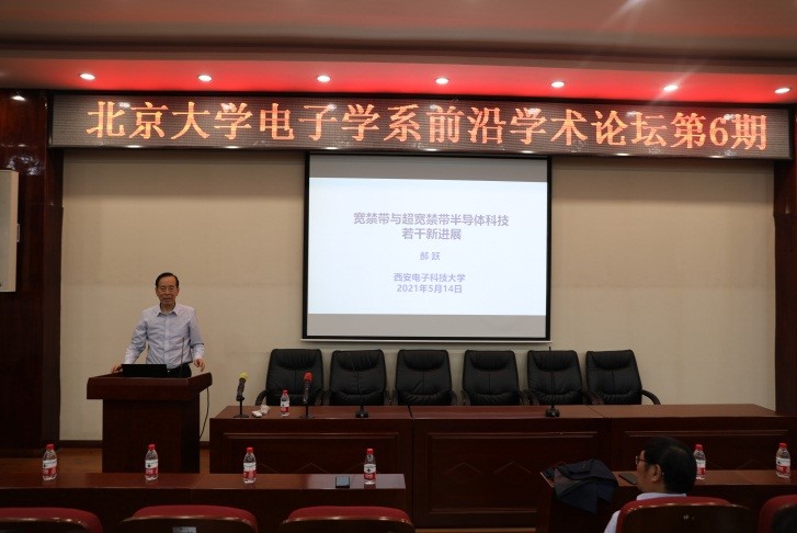 理科二号楼2129报告厅如期举行。本期论坛邀请到中国科学院院士、西安电子科技大学的郝跃教授作主题为“宽禁带与超宽禁带半导体科技的若干新发展”的学术报告。讲座由电子学系副系主任张志勇教授主持,全系近100名师生到场聆听了报告。