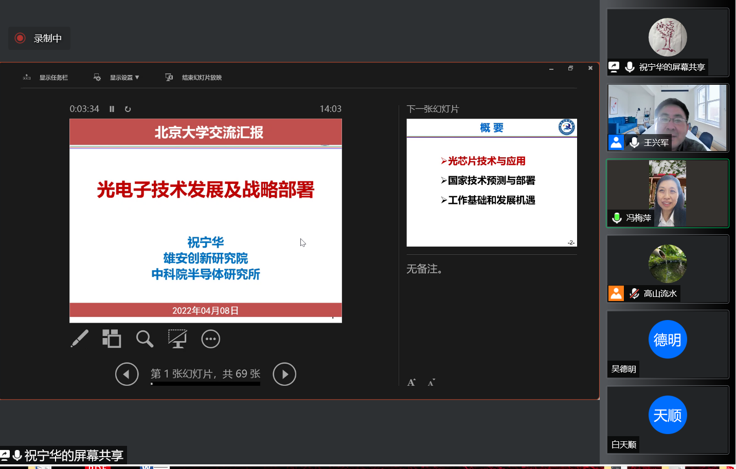 会议开始,祝宁华院士从光芯片技术与应用、国家技术预测与部署、工作基础和发展机遇介绍了报告的提纲,随后展开了精彩报告。