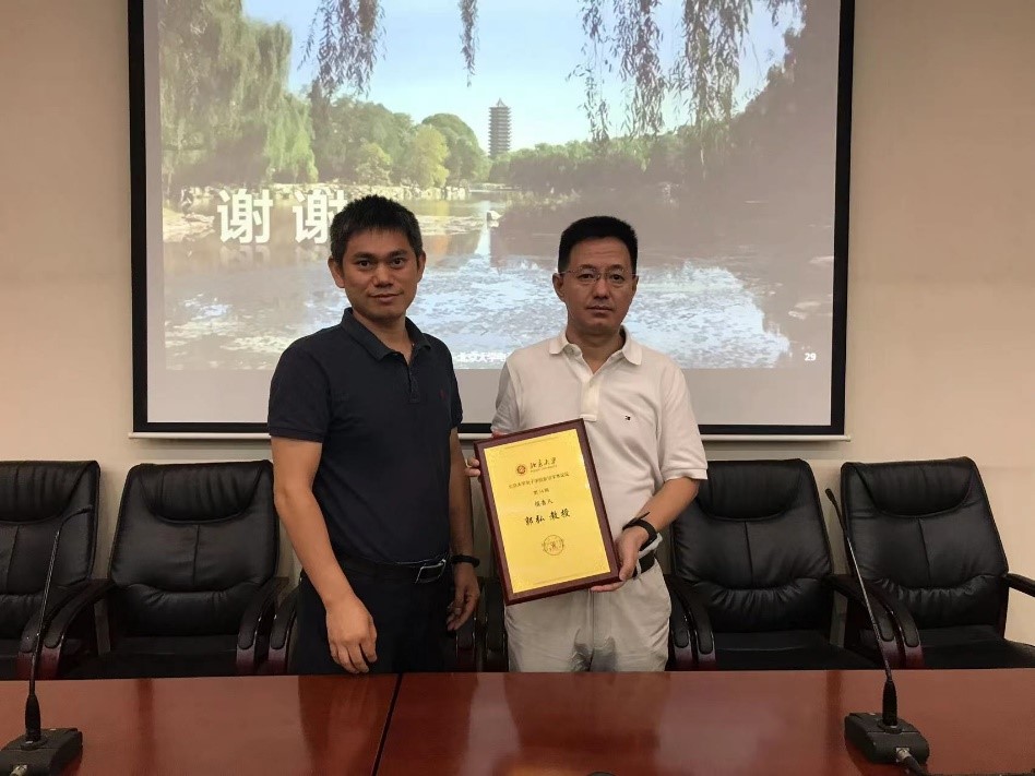 在讨论环节,与会师生积极提问。郭教授针对通用量子计算技术的发展、海底磁探测的实现、磁力仪的小型化、Wootters量子不可克隆定理的证明等问题进行了深入细致的回答。随后,魏贤龙副院长代表学院为郭弘教授颁发了成人影片