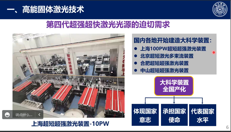 讲座开始时,柳教授就高能固体激光技术展开介绍,大能量超短固体激光器具有单脉冲能量高、峰值功率高等突出优点,在工业、科研、国防、医学等众多领域中备受青睐。同时应第四代超强超快激光光源的迫切需求,国内各地大装置高能固体激光器技术蓬勃发展。