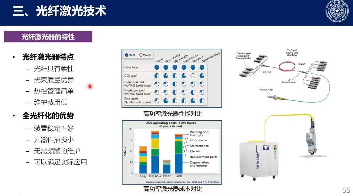 第三部分的主题是光纤激光技术,柳教授介绍光纤激光器具有光线柔性、光束质量优异、热控管理简单、维护费用低等特点,同时全光纤化的系统具有稳定性好、器件掺入损耗小、维护简易等优势,因此光纤激光器在工业制造、军事应用和生物医学方面都有广泛应用。为实现光纤激光器光谱亮度的提升,需要对谱外噪声进行滤除,针对此问题,柳教授介绍了采用啁啾倾斜光纤布拉格光栅实现谱外噪声滤除的方法,大幅度提升受激拉曼散射的阈值功率。