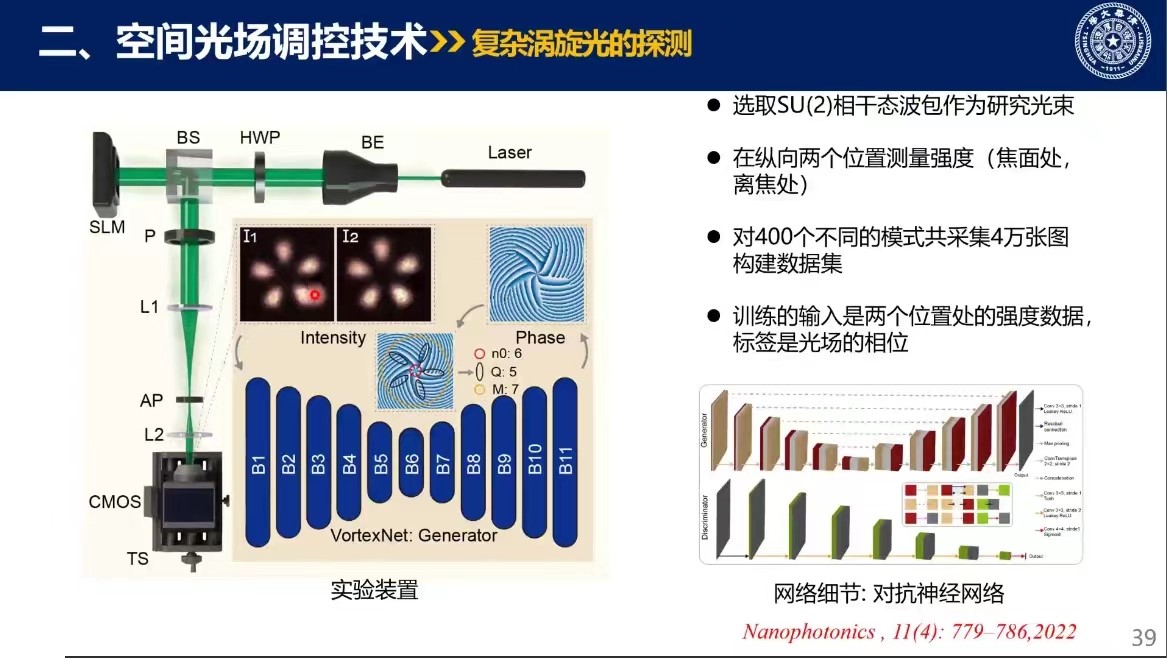 第二部分的主题是空间光场调控技术,主要介绍了像散混合结构光、复杂涡旋光探测、三维非均匀自加速光场——星系光波、多奇点结构光的腔内可控产生、光子的朗道能级以及多奇点结构光的倍频模式等内容。其中就复杂涡旋光的探测展开了较为详细的讲述,柳教授指出,对于但奇点涡旋光束测量方法有干涉、衍射、几何变换、多平面光转换(MPLC)等,但针对多奇点涡旋光束(涡旋晶格、SU2光束)的定量测量问题处理起来仍较为棘手。为定量测量多奇点涡旋光束,需要测量光场相位中蕴含的拓扑信息,深度学习算法的引入可以解决传统测量含奇点相位方式在易受噪声影响、迭代复杂、测量区域小等方面的不足之处。