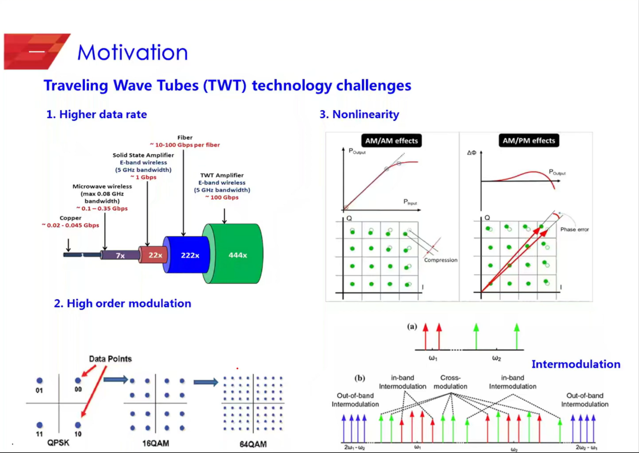 冯研究员的讲座主要分为三个部分。在第一部分,冯研究员介绍了真空电子器件在无线通讯中的优势及应用前景,同时以行波管为例,指出了无线通讯对真空电子器件提出了大功率、高效率、高线性等更高的要求。