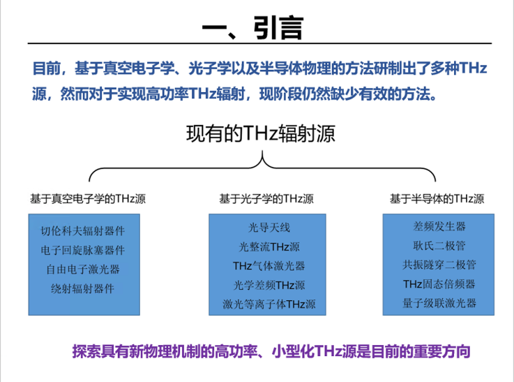 宫玉彬教授在报告中首先强调了太赫兹频段的重要性和广阔的应用前景,由于其特殊的频谱位置,太赫兹在许多领域具有广泛的应用场景。太赫兹源作为太赫兹应用的基础,引起了广泛关注。目前已经有基于真空电子学、光子学和固体物理等方法的太赫兹源,但产生太赫兹波的传统方法都面临一系列难题,迫切需要探索新的物理机制,发展高功率和集成化的太赫兹波源。