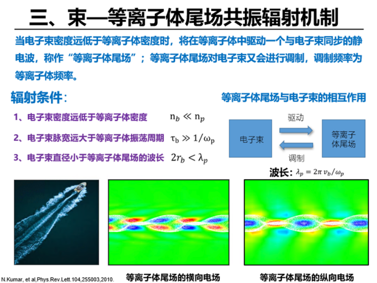 当电子束密度远低于等离子体密度时,出现了束-等离子体尾场共振辐射机制。在这种机制中,电子束在等离子体中的扰动引发了一个同步的静电波,该电场的旋度为0,称为等离子体尾场。该尾场与电子束发生调制,调制频率等于等离子体的频率。该互作用过程包括线性调制阶段、非线性调制阶段和崩溃阶段。在非线性调制阶段,电子束团在电场的作用下呈现出明显的周期性聚束,同时驱动高频电磁辐射。随着辐射的产生,聚束束团将逐渐崩溃。对这种辐射进行分析可以看到,基频出现在等离子体频率附近,并且存在一系列高次谐波的高频电磁辐射,峰值功率密度可达到0.2MW/CM²。为了进一步提高系统的辐射效果,在原有结构上增加了慢波结构,从而在更大的结构尺寸下实现太赫兹辐射。当电子束被尾场调制后,介质会形成网状模式结构,意味着本征模式被激发。而对于电子束的纵向调制也逐渐转变为密度调制,在减速区形成周期性聚束点。调制后的电子束携带一系列高次谐波,能够有效与系统内的高次本征模式相互作用。理论仿真表明,该系统辐射的峰值功率可达到7.9MW,最大能量转换效率为8.3%。