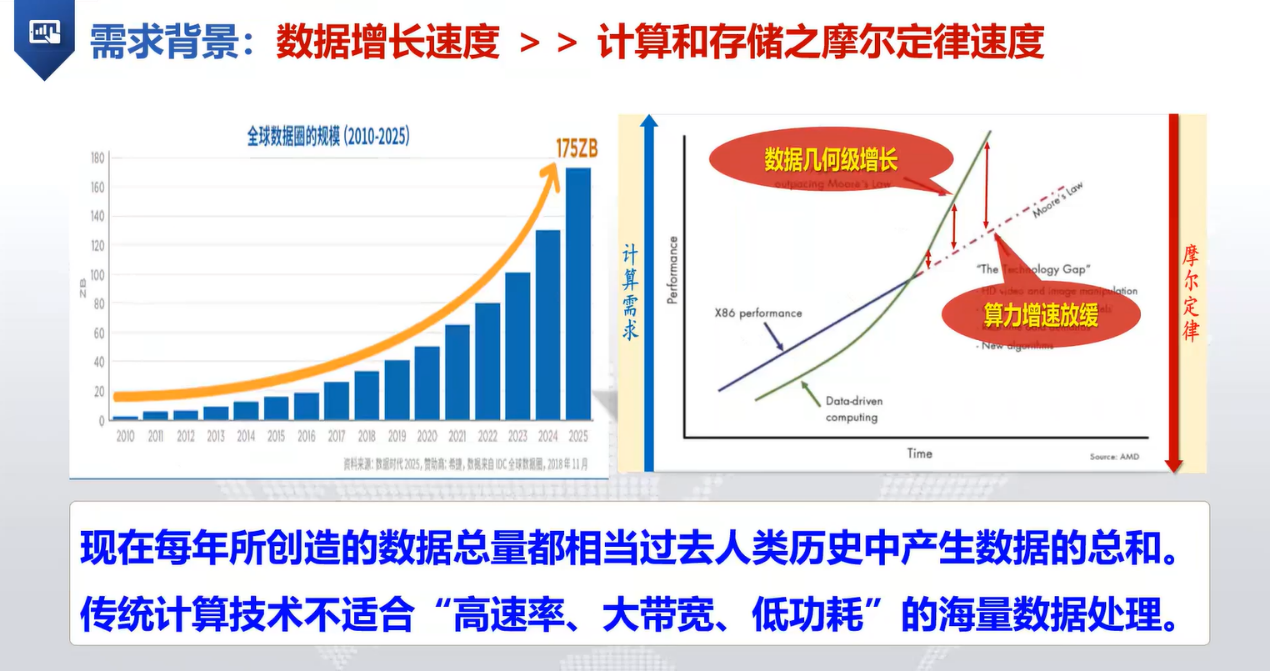 首先,李老师介绍为什么要做光电智能计算。因为当前数据呈现几何级的增长而算力增速放缓,传统计算技术不适合“高速率、大宽带、低功耗”的海量数据处理。同时,介绍了光计算的特点集成度低、控制难、存储难、图灵完备性存疑,电计算的特点是功耗高、带宽低、时延高、物理制造极限限制,进而介绍了光电融合智能计算面临的机遇与挑战。
