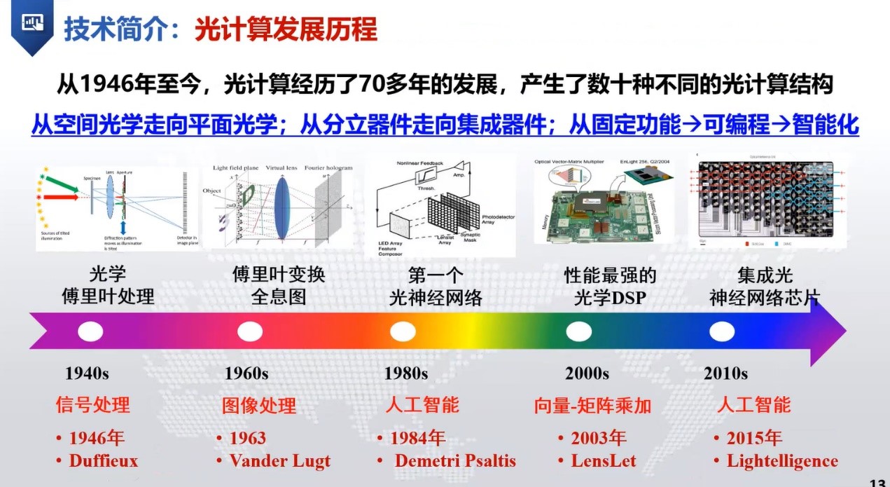 接着,李老师介绍了光计算的定义,模拟光计算和数字光计算以及光计算的模拟与数字技术路线之争。李老师梳理了光计算的发展历程,从1946年至今,光计算经历了70多年发展,产生了数十种不同的光计算结构,从固定功能发展到可编程进而发展到智能化。