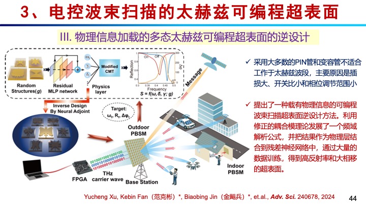 最后,金教授介绍了一种物理信息加载的多态太赫兹可编程超表面的逆设计方案。为了克服二极管插损大、开关比小和相位调节范围有限的问题,团队提出了一种可编程波束扫描超表面的逆设计方法,该方法可以加载物理信息。研究团队利用修正的耦合模理论发展了一个频域解析公式,并将结果作为物理层结合到残差神经网络中。通过大量数据训练,研究得到了一种高反射率和大相移的超表面。利用收敛速度更快的瓶颈式残差神经网络,该设计实现了液晶超表面的相位变化达到300度。实验结果与模拟结果基本一致,显示出良好的实用性。