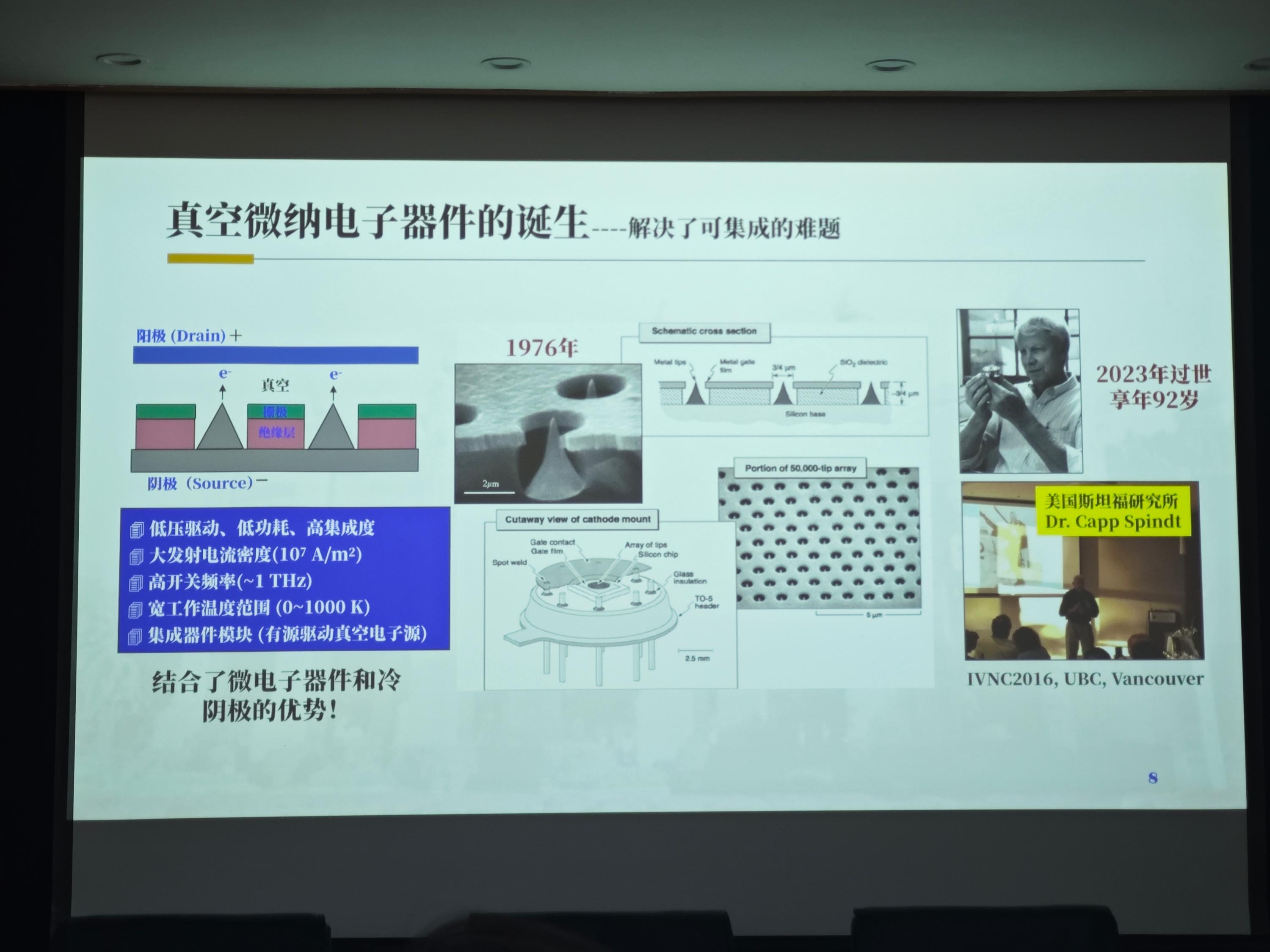 佘教授首先介绍了场发射电子源的研究背景。真空电子管自上世纪中期开始,在计算机、太空、医疗等领域逐渐被广泛使用。与固态器件相比,真空电子管具有高截止频率和高输出功率、受温度和辐射影响小等优势。此外,在产生电子源的几种方式中,场发射电子源具有亮度大、能量发散度低等优点。通过微纳加工技术制造的,以阵列式场发射电子源为核心的真空微纳电子器件,结合了微电子器件和冷阴极的优势,使得器件具有低压驱动、低功耗、高集成度,大发射电流密度,高开关频率,宽工作温度范围等特点。