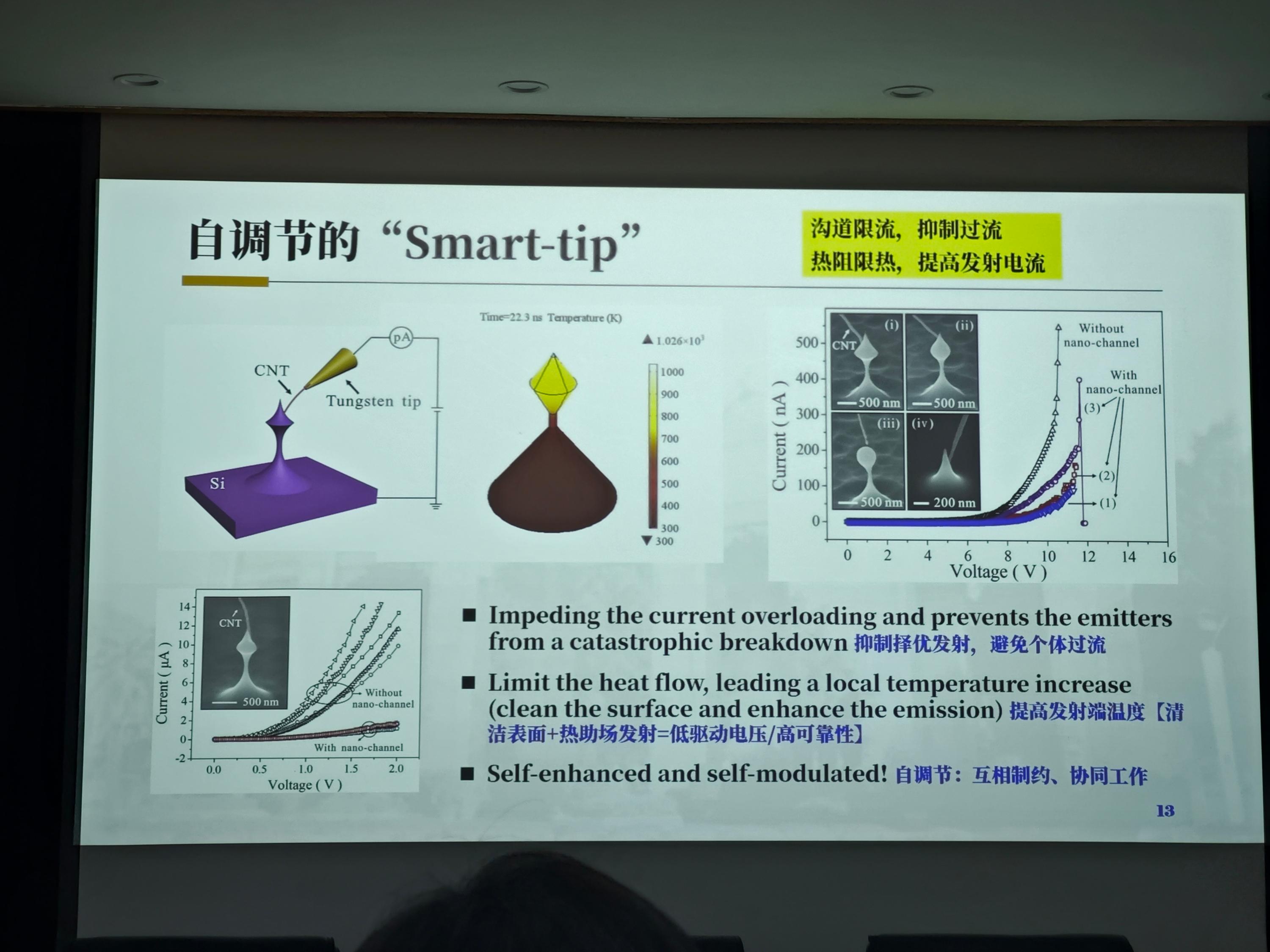 随后,佘教授详细介绍了其课题组在硅基高性能场发射电子源方面系统的研究。通过设计纳米加工工艺,制作了具有自调节功能的smart-tip结构。该结构中极窄的纳米沟道起到限制电流和限制热量耗散的作用,从而提高发射电流,抑制阵列式电子源“择优发射”的问题。基于杂质分凝原理制造的纳米尖端,可以精准调控尖端的杂质浓度,实现发射的均一性。利用P型硅反型层电子分布调控技术,提高了电子输运特性的一致性。同时提出了顶端局域非平衡载流子的自限制产生机制,在理论上解释了该结构在实验中出现的现象。佘教授通过大量的探索及创新,基本解决了阵列式场电子源难以产生大电流发射,以及发射的重复性、可靠性、一致性差的难题。